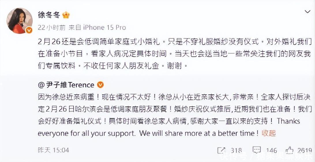 原本以为,这会是一场甜到出圈的婚礼。没想到,临近官宣时间,却突然迎来变数。相恋多年的尹子维与徐冬冬,前不久才对外公布将于2月在哈尔滨举办婚宴,消息一出,不少网友直呼“终于等到这一天”。然而就在婚期越来越近之际,尹子维却突然在社交平台发声,宣布婚礼安排出现调整。